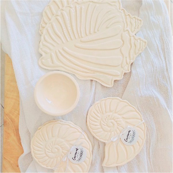 1 Plato caracola de cerámica beach Medida: 25 x 19 | Color: Crudo 2 Palto caracola de ceramica mini beach Medida: 16 x 13 | Color: Crudo 2 Cuenco salsero de cerámica Medida: 5 x 10 | Color: Crudo