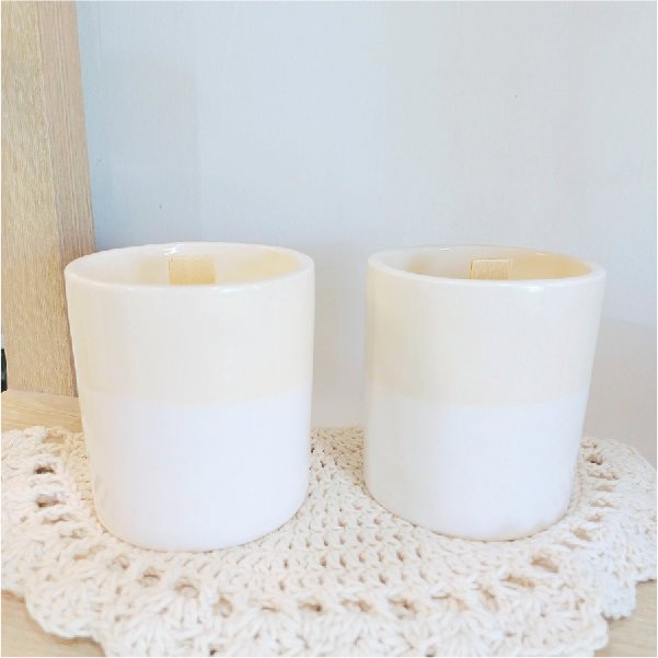 Cuenco de ceramica con vela Medida: 9 x 11 Color: Crudo y blanco Fragancias: Beach Flower – Wild Flower – Lemon grass – White Flowers